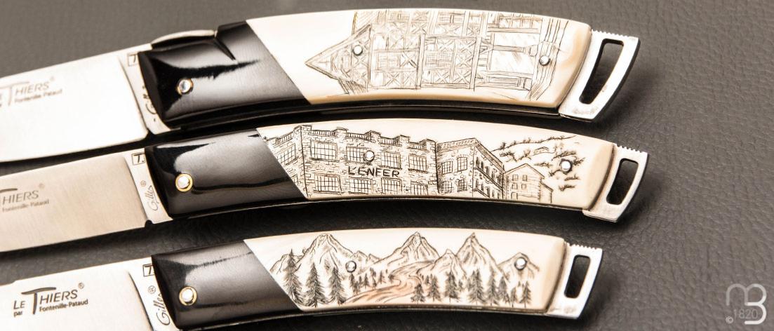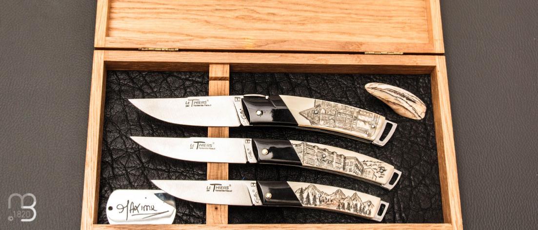 Nous vous proposons ici un coffret de 3 Thiers® d'exceptions de la coutellerie Fontenille Pataud, avec un srimshaw sur chacun des manches, un Thiers® Pocket, un Thiers® Nature et un Thiers® Gentleman