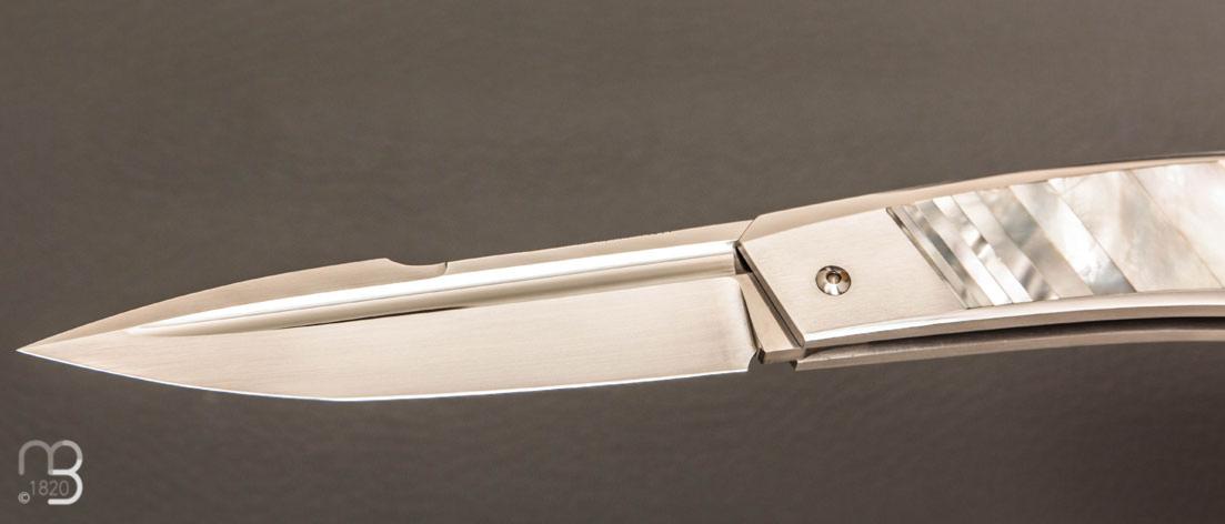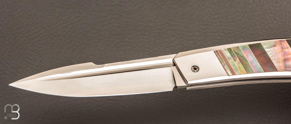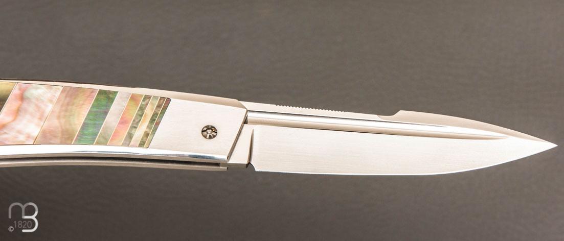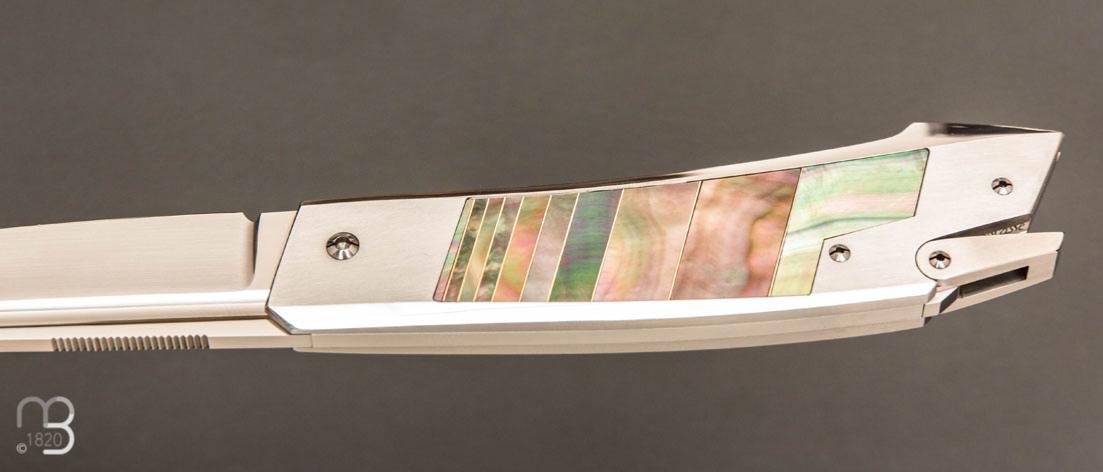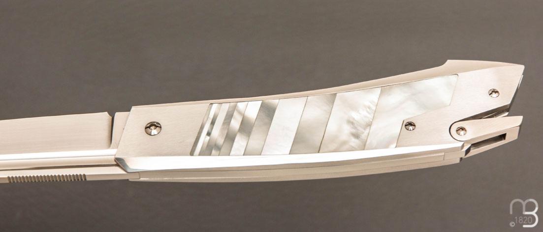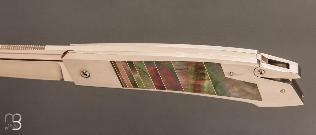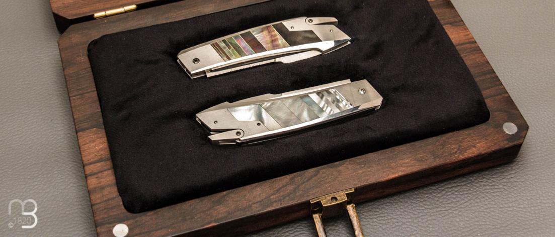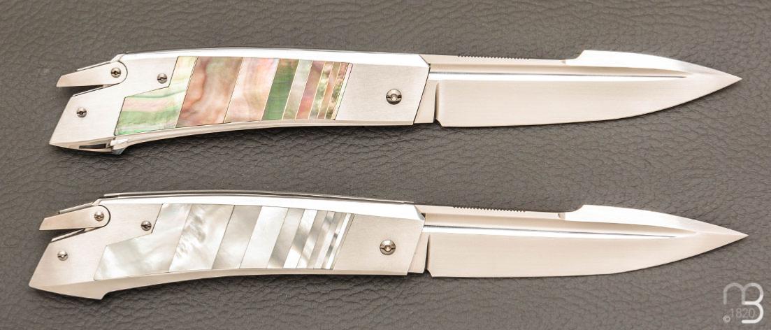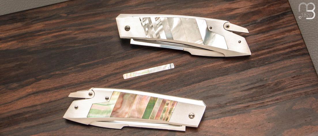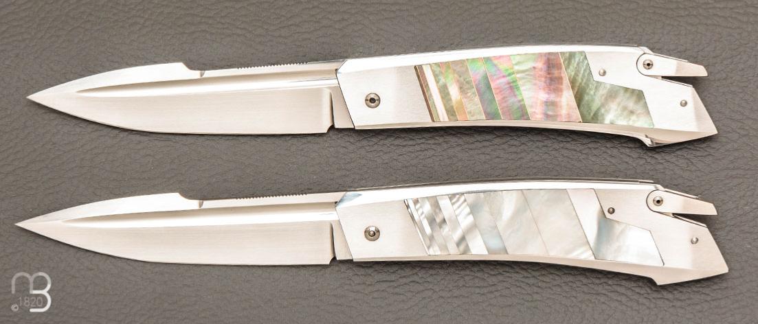 Couteaux custom en nacre noire et nacre blanche, système reverse back lock