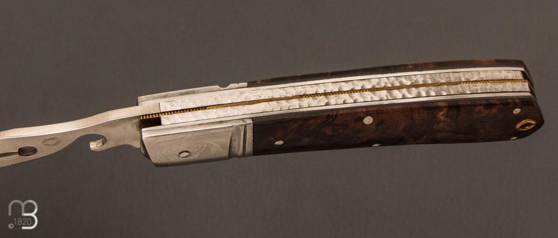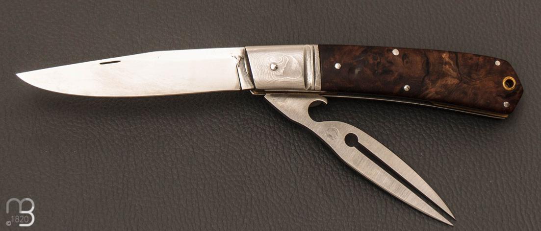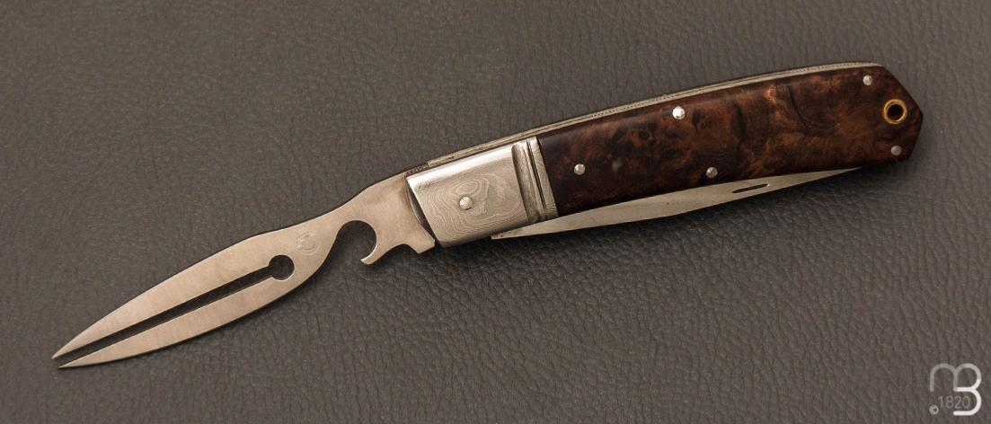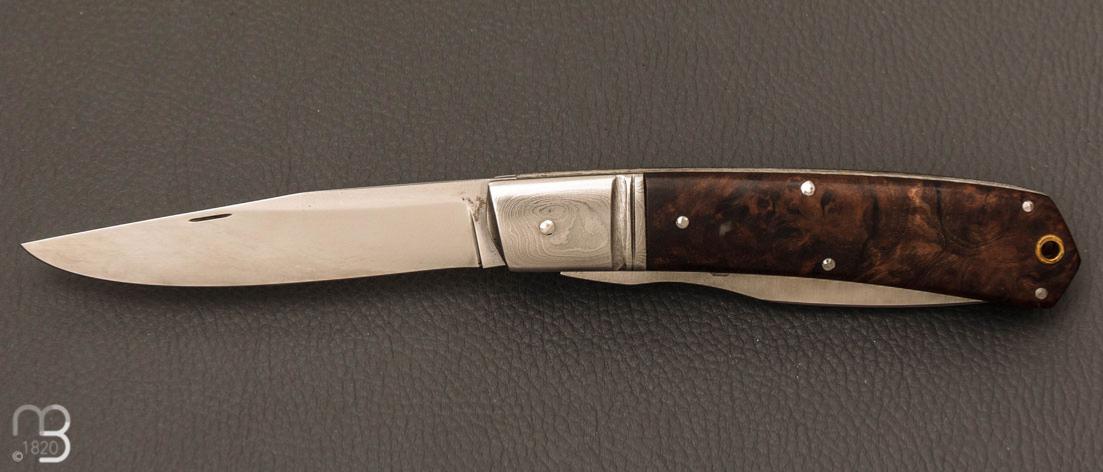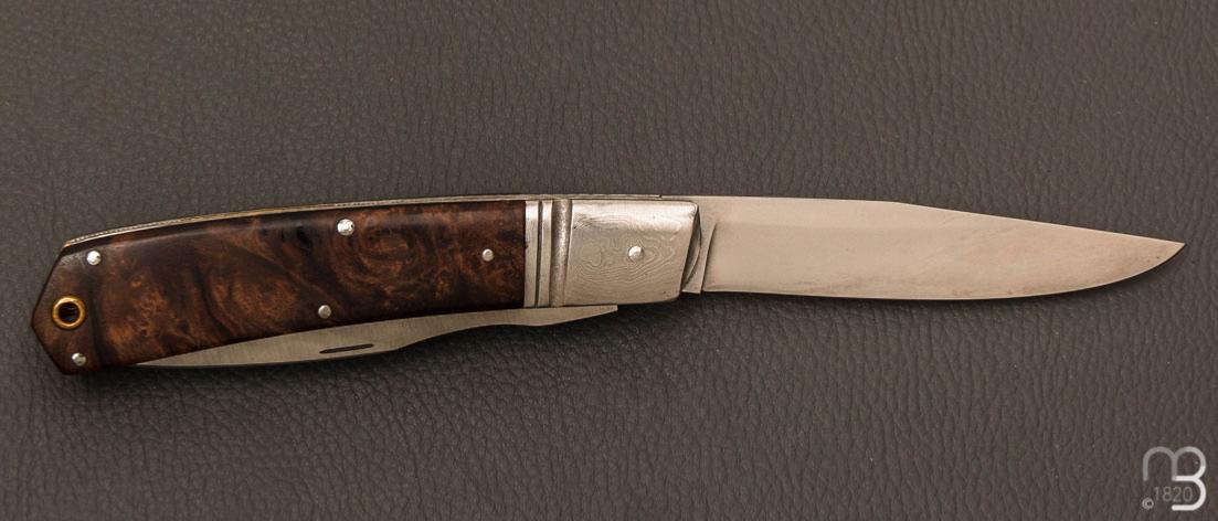 Couteau de poche fait artisanalement par Denis Lagarde avec de jolies plaquettes en loupe de noyer stabilisée