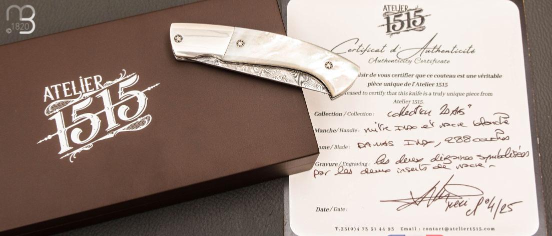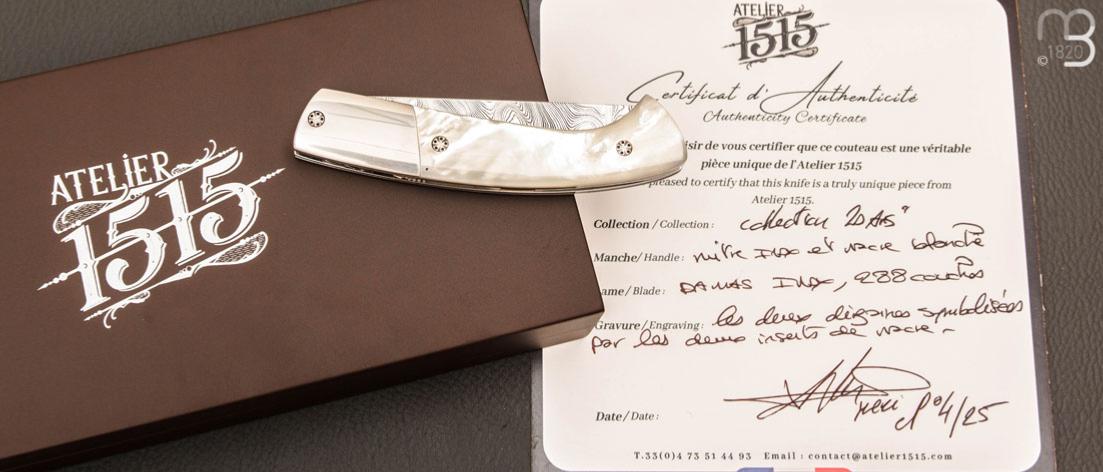 Couteau 1515 collection " 20 ans N°4/20 " par Manu Laplace - Nacre blanche et lame en damas inoxydable