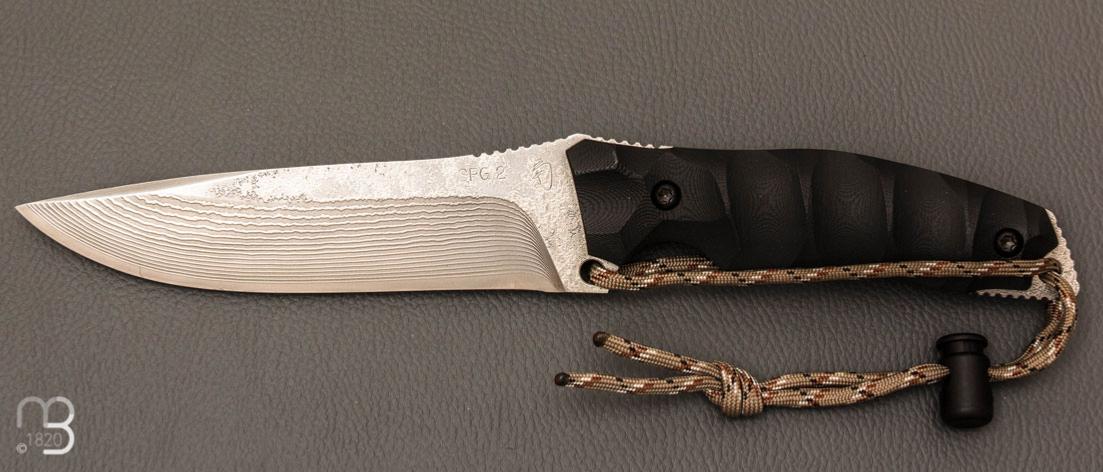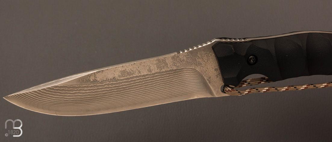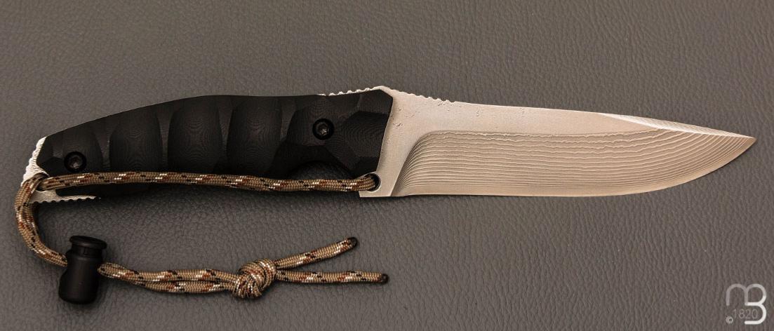 Manche composé de plaquettes en G10 noir, profilé à la forme de la main avec lanière de retenue des doigts.