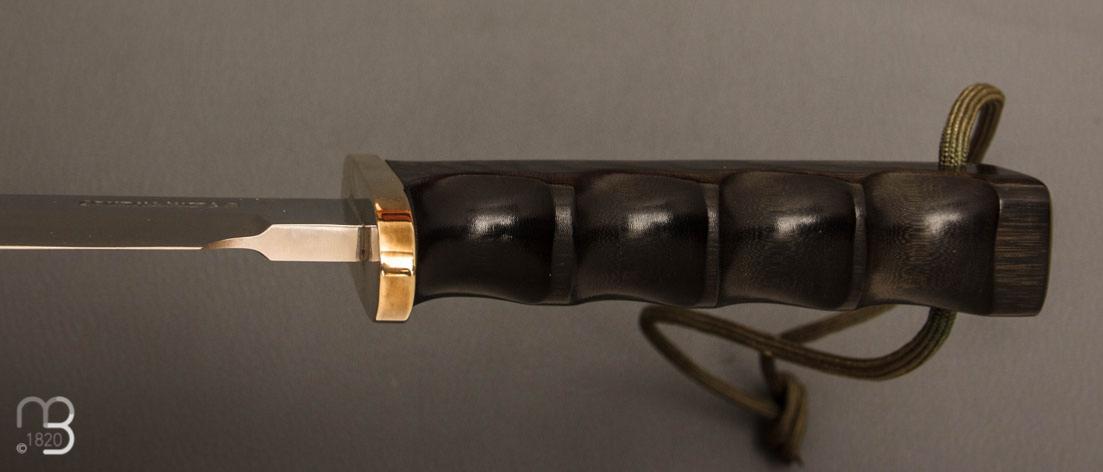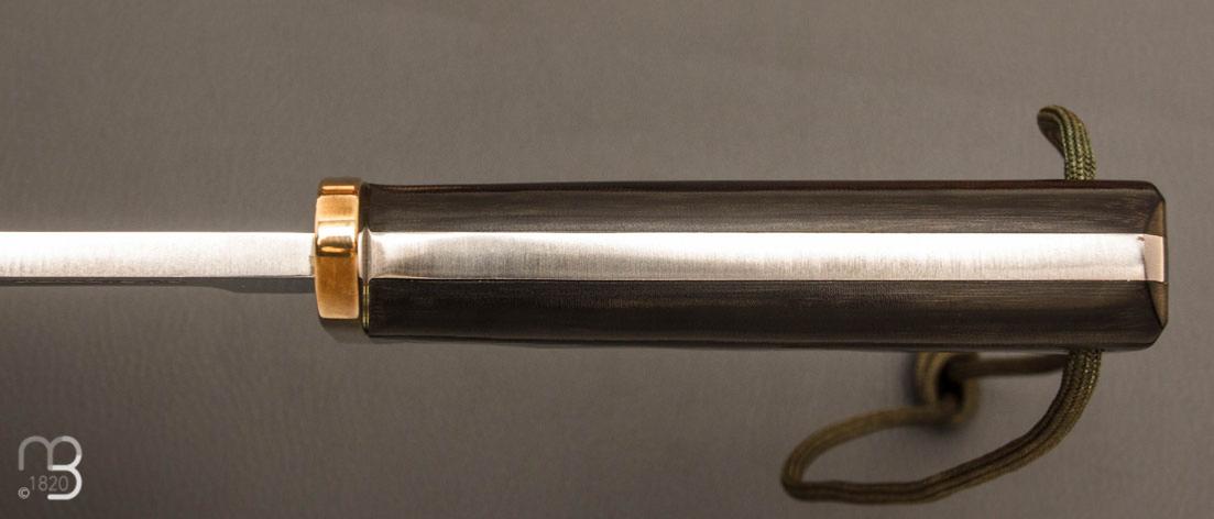 Manche en micarta noir, travaillée pour épouser la forme des doigts.