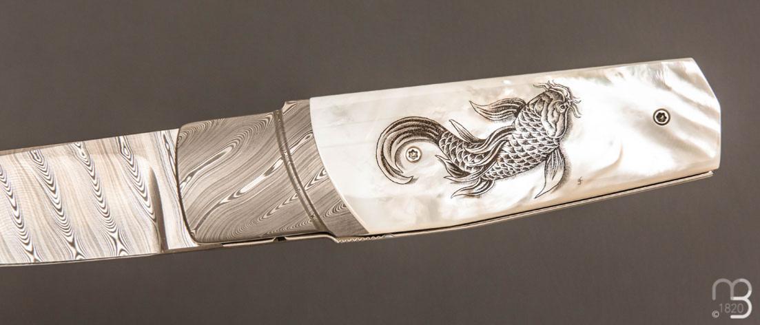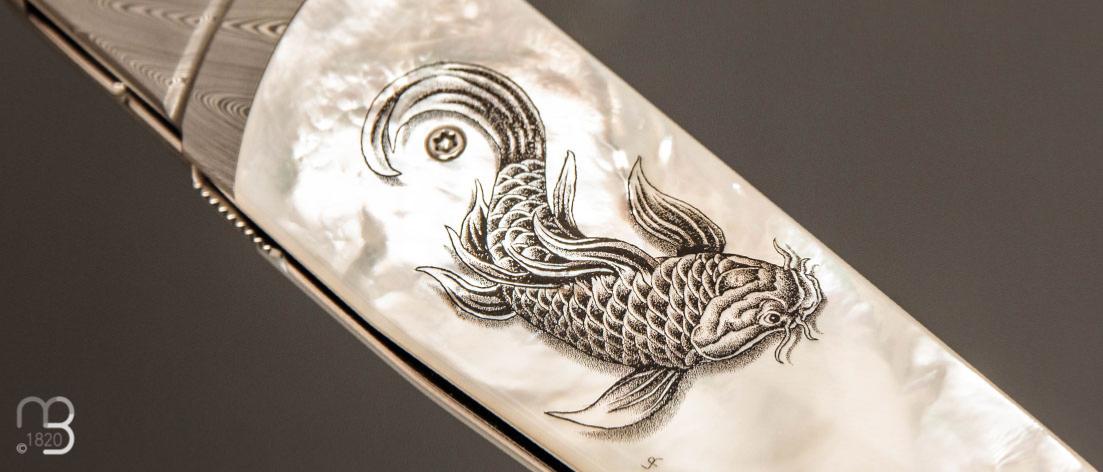 Manche en nacre blanche avec gravure "Carpe Koï" de Lucas Roccaforte