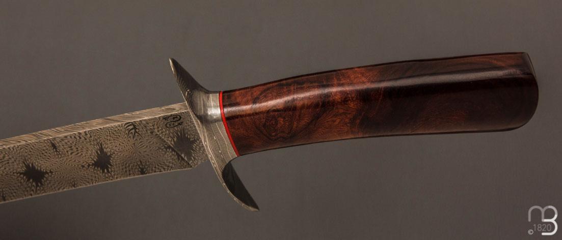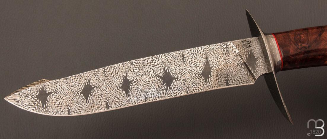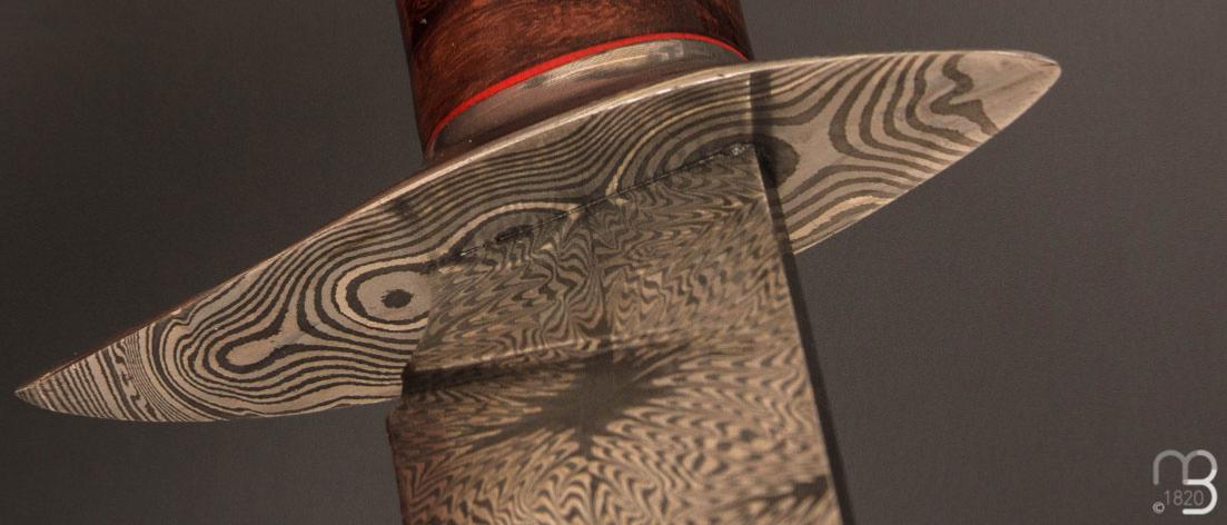 Un très beau couteau droit forgé de la main de Nicolas Mestrallet, avec une lame en acier Damas mosaïque carbone et un manche en palissandre du Honduras