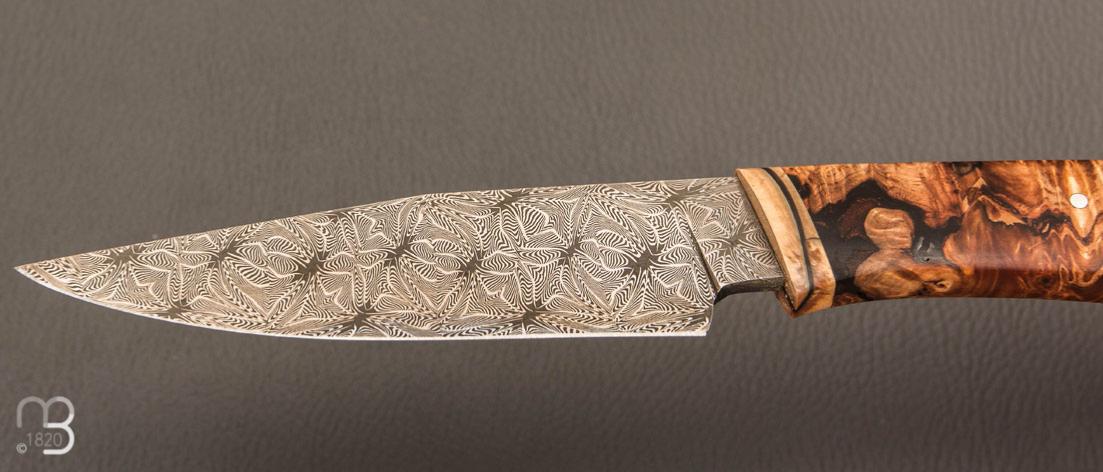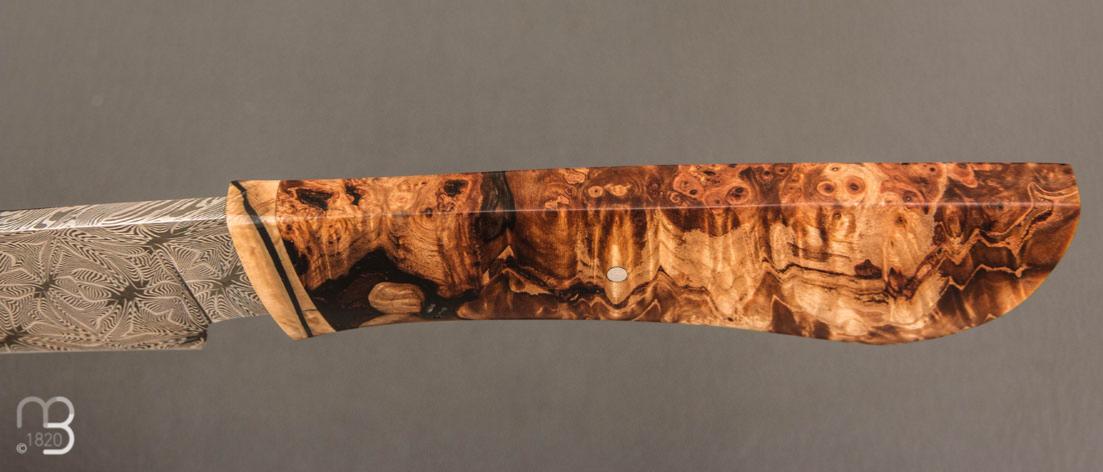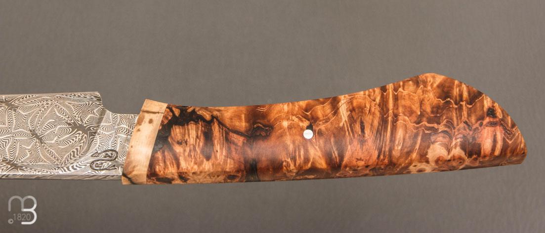 Un très beau couteau droit forgé de la main de Nicolas Mestrallet, avec lame en acier carbone damas mosaïque et manche en loupe de marronnier stabilisée
