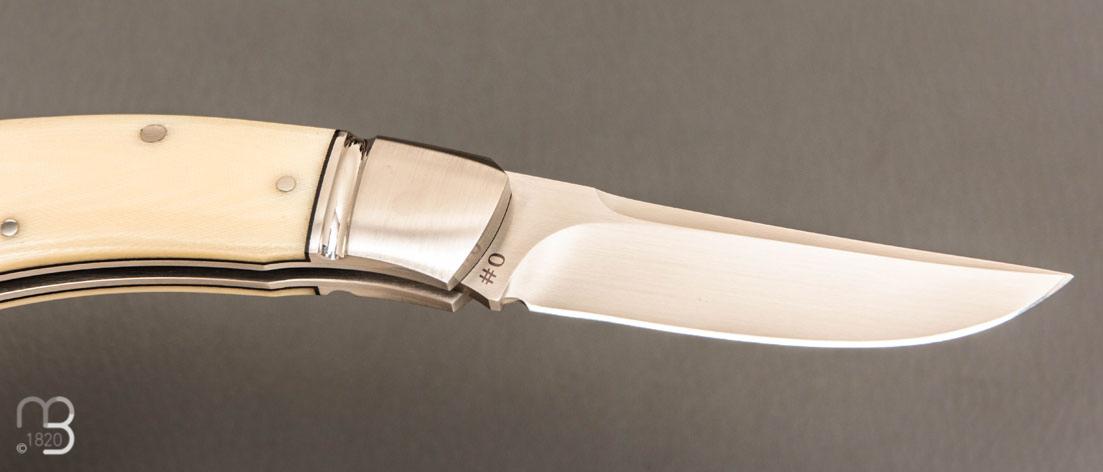 Manche en micarta blanc, avec écusson en bois de cerf.