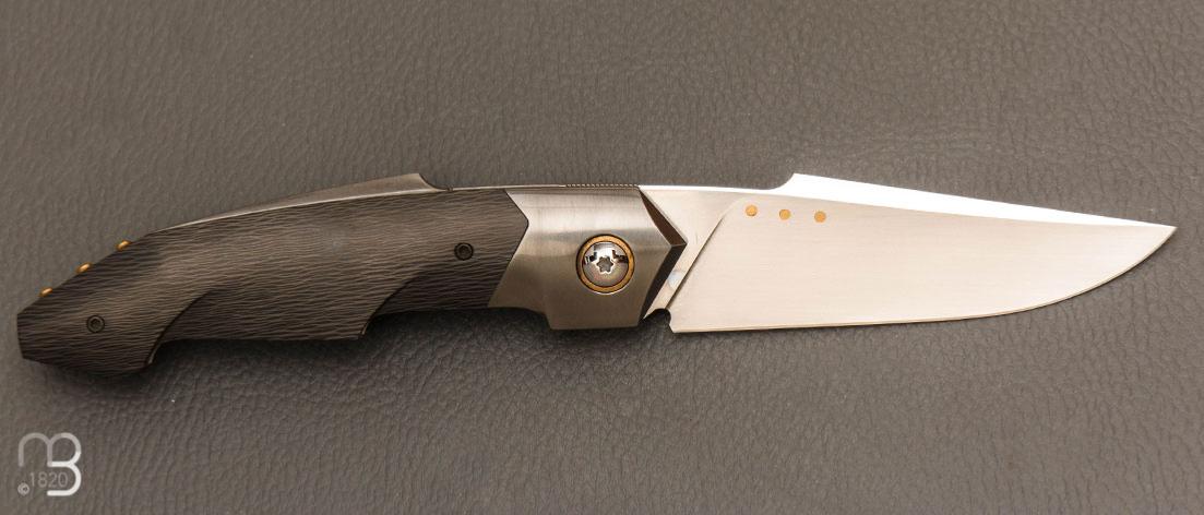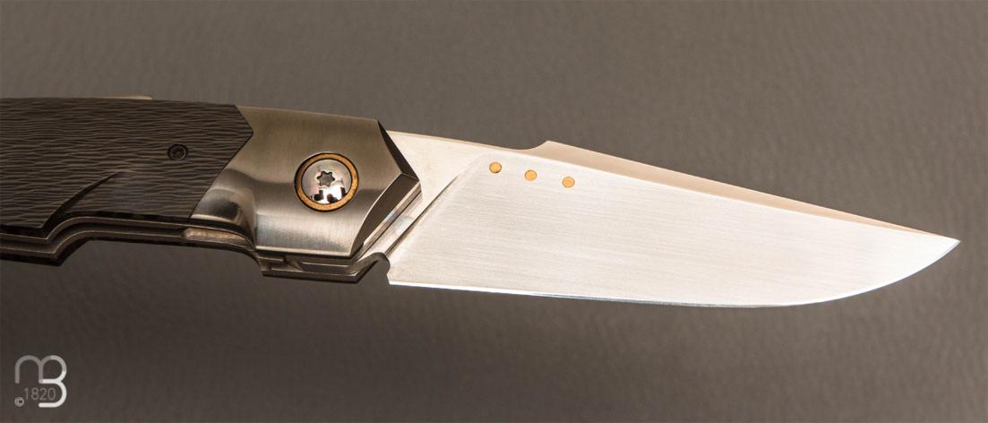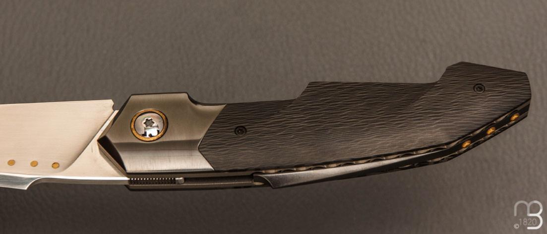 Un couteau front flipper parfaitement réalisé par le coutelier Romain Lopez, avec de jolies plaquettes en fibre de carbone "sidecut"