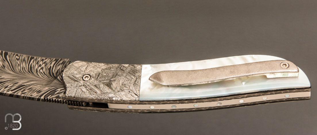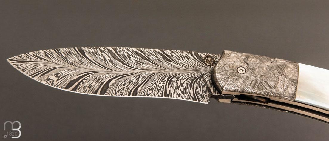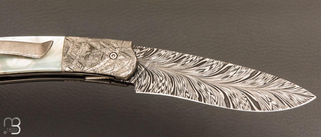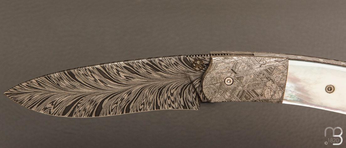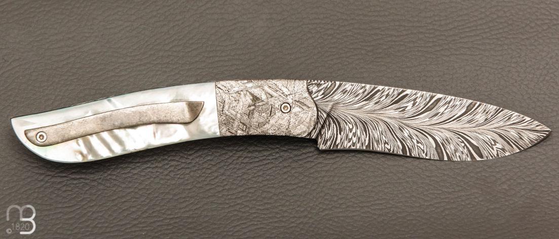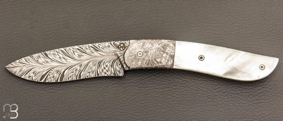 Le GYR est le nouveau modèle du jeune coutelier Français Tim Bernard, ici proposé en version "luxe" avec des plaquettes en nacre blanche, mitres en météorite et une lame en damas plume forgé par Tim.