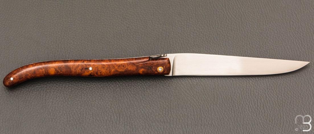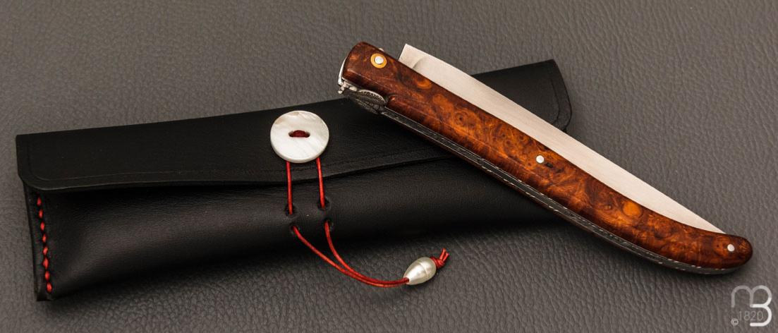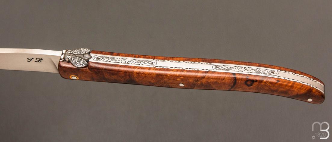 Couteau de poche de collection modèle "Laguiole" avec de jolies plaquettes en loupe de bois de fer et ressort entièrement gravé