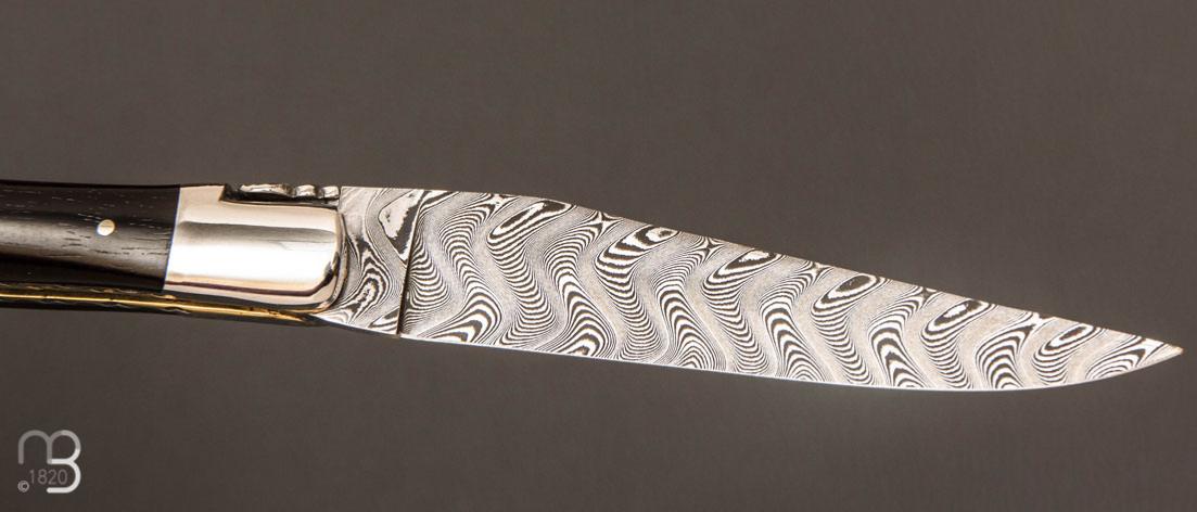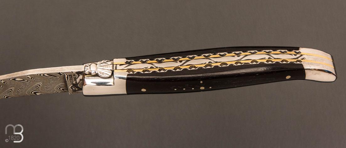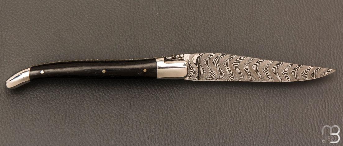 •    Couteau Laguiole en Aubrac 12 cm double platines laiton manche ébène et lame damas