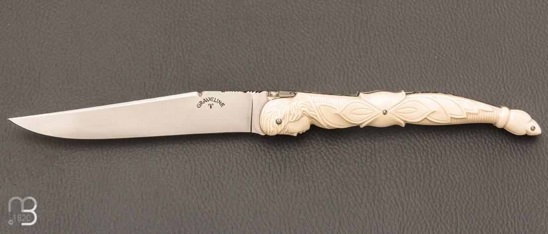 Les couteaux de collection d'Isabelle et Pascal Graveline sont aussi rares que précieux. Nous avons eu la chance d'en trouver un à vous proposer. Une merveille de simplicité, dont la mouche et le ressort monobloc  ont été gravés.
