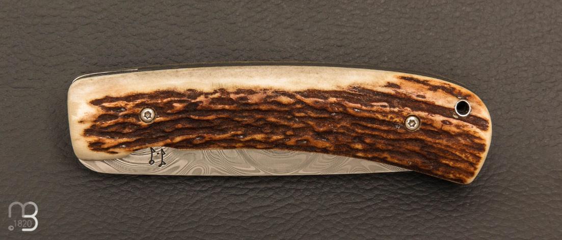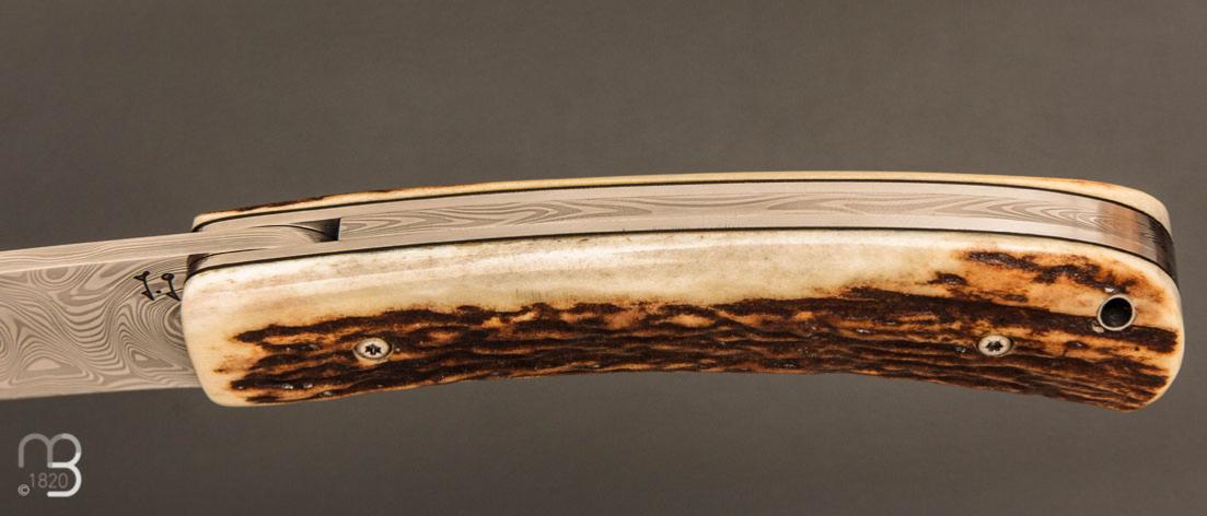 Couteau " liner lock " custom par Joël Grandjean - Bois de cerf et lame en damas