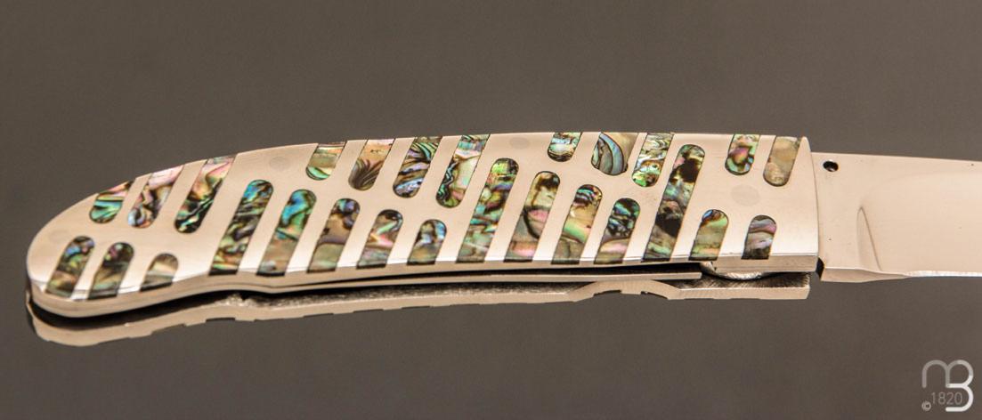 Manche en acier inoxydable 416 avec inserts en abalone (coquille d'ormeau naturelle).
