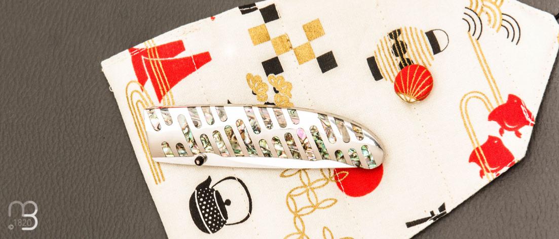 Couteau " Linerlock " custom par Koji Hara - Abalone et lame en Cowry-Y