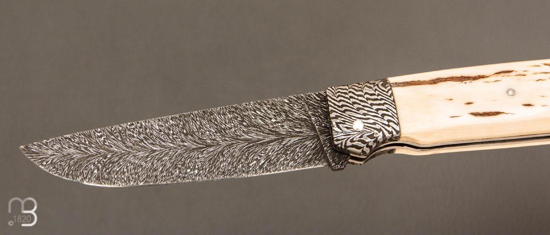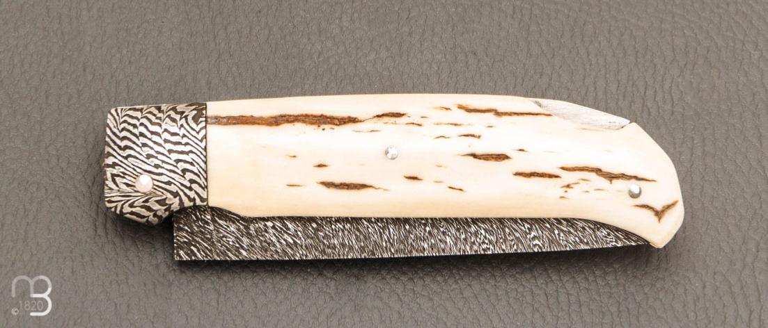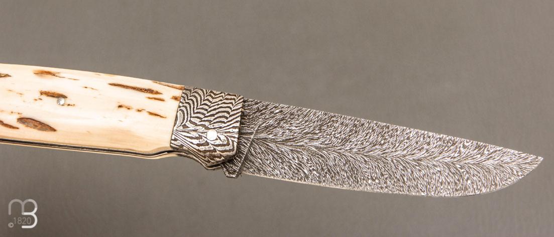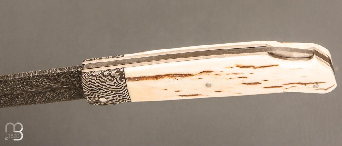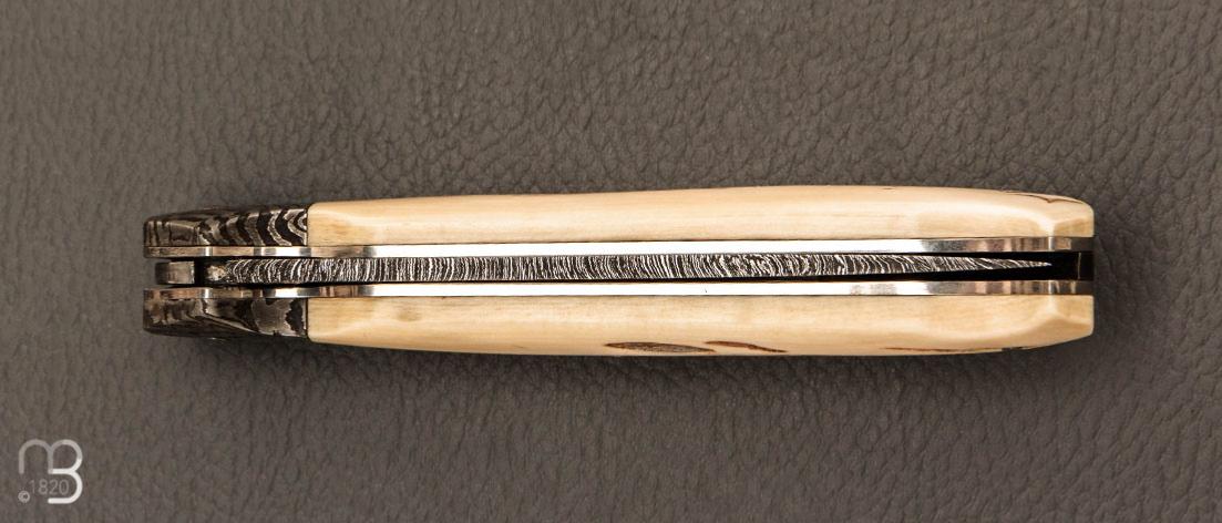 Couteau " Lock back " custom par Karim Valentin - Les couteaux D'Hure - Ivoire de mammouth et lame en damas plume