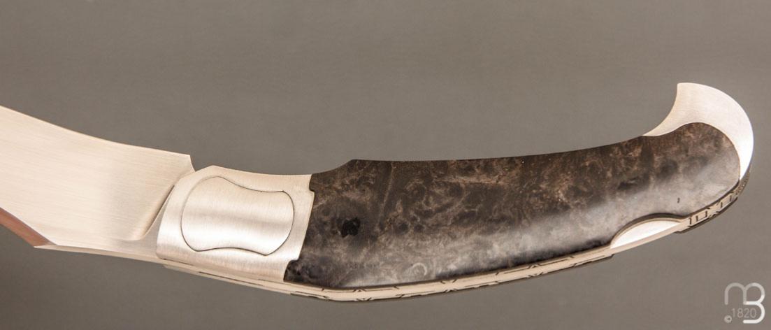 Manche composé de plaquettes en loupe d'amboine teintée et stabilisée, platines et mitres intégrales en acier inoxydable.