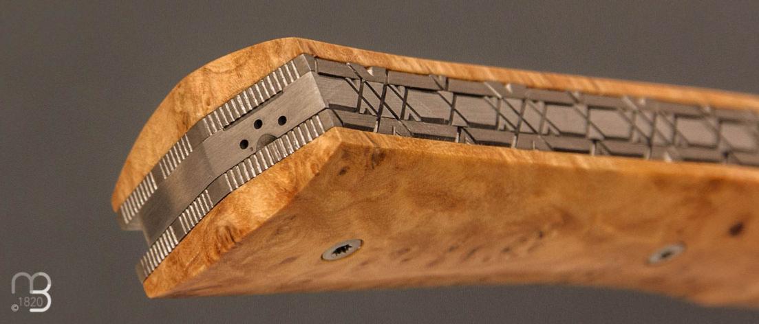 Couteau de poche "Oiseleur" plaquettes loupe de bouleau stabilisée, fait main par Cyril Kalisz.