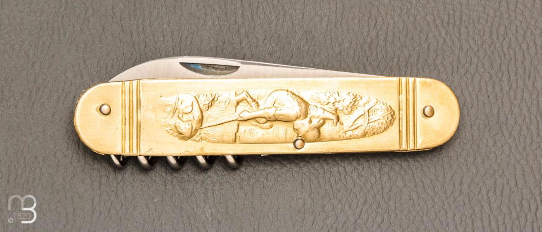 Manche en laiton estampé à froid vernis, motif touriste, longueur 105 mm