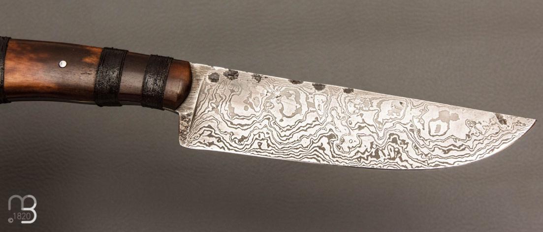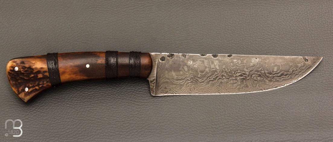 Couteau " Primitif " droit forgé par Pierre Henri Monnet - Bois de cerf et damas carbone
