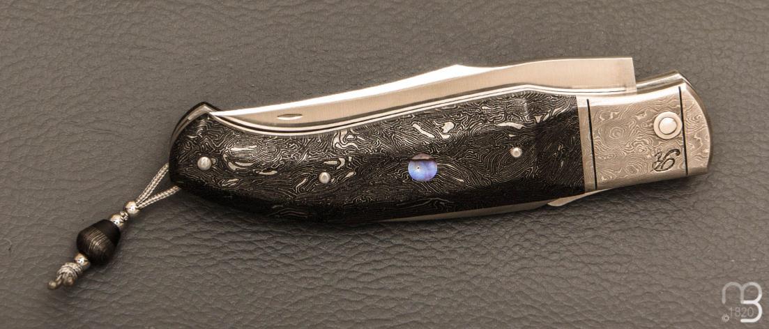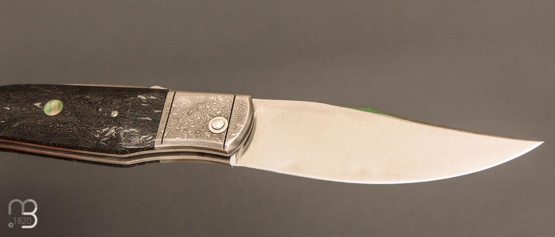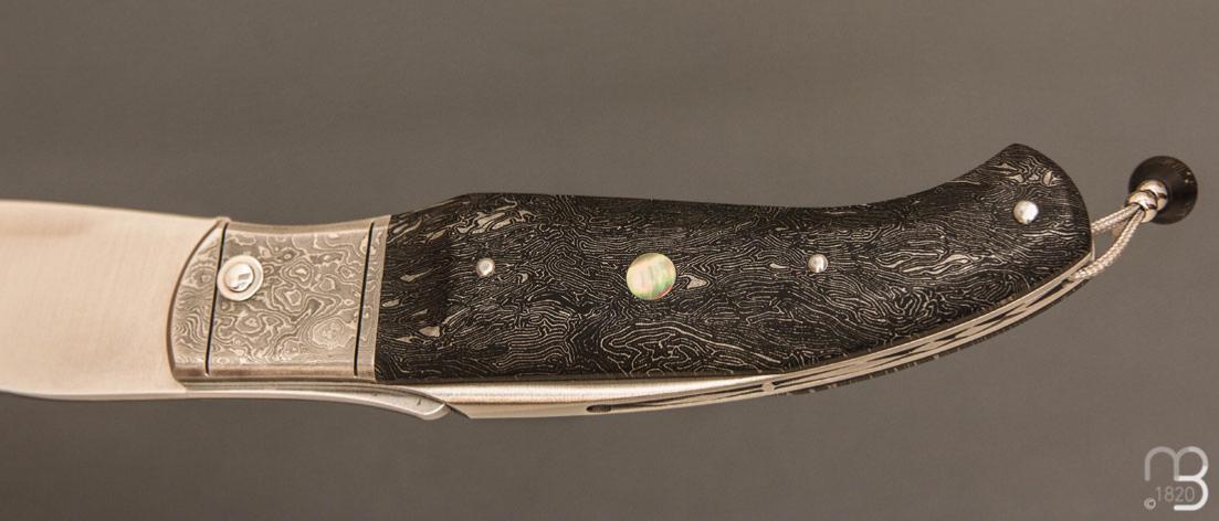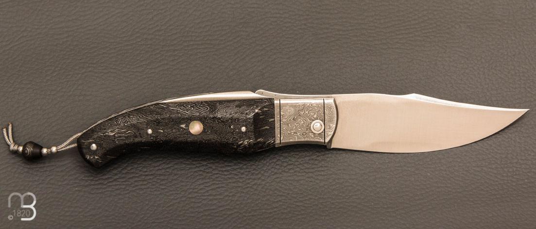 Un " Truand " avec lame en acier inoxydable RWL34 et plaquettes en Factcarbon Space Coral par le coutelier de l'Hérault.