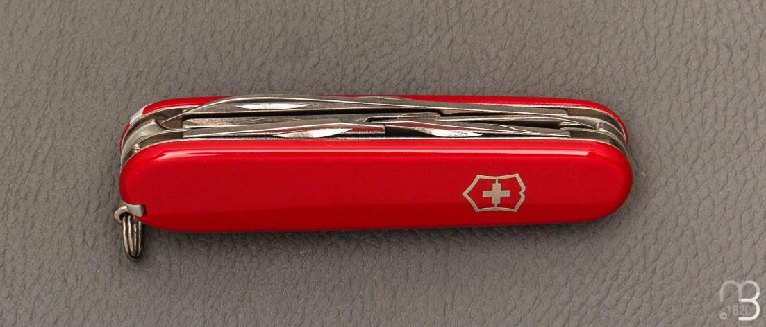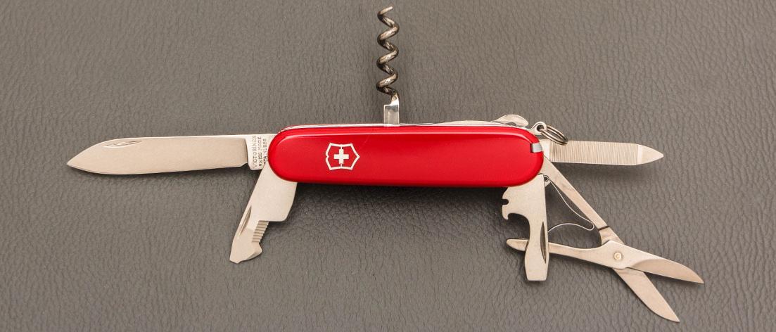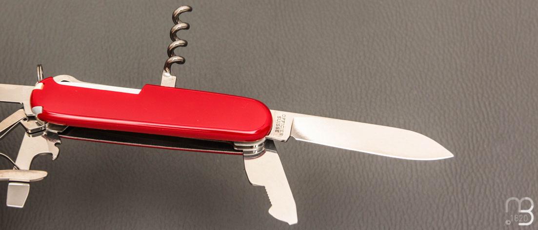 Grande lame / Tire-bouchon / Ouvre emballage / Tournevis 3mm / Décapsuleur / Tournevis 6 mm / Dénudeur de fils électriques / Poinçon alésoir / Ciseaux / Crochet multi-usages / Anneau / Pincettes / Cure-dents / Stylo à bille pressurisé / Lime à ongles / Cure-ongles