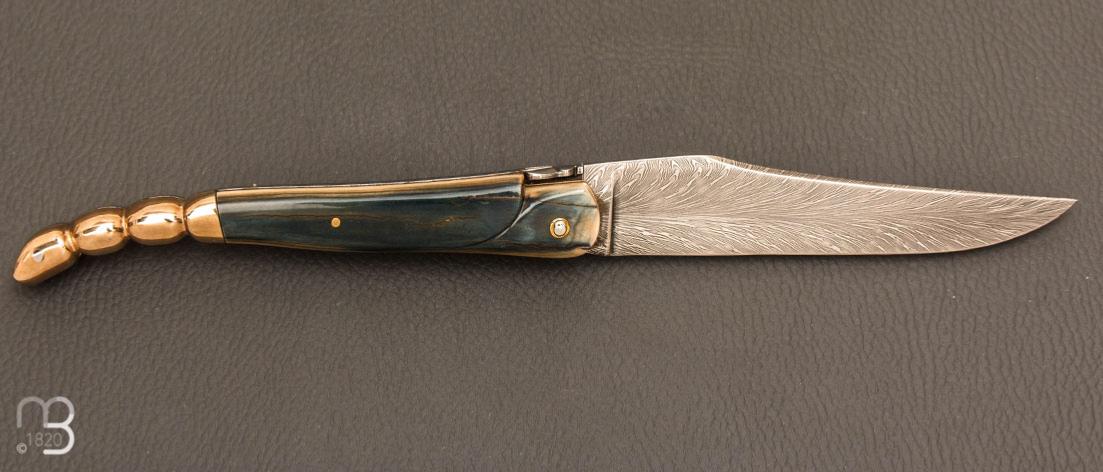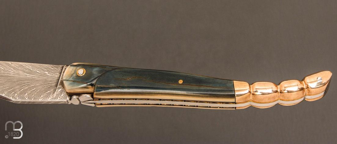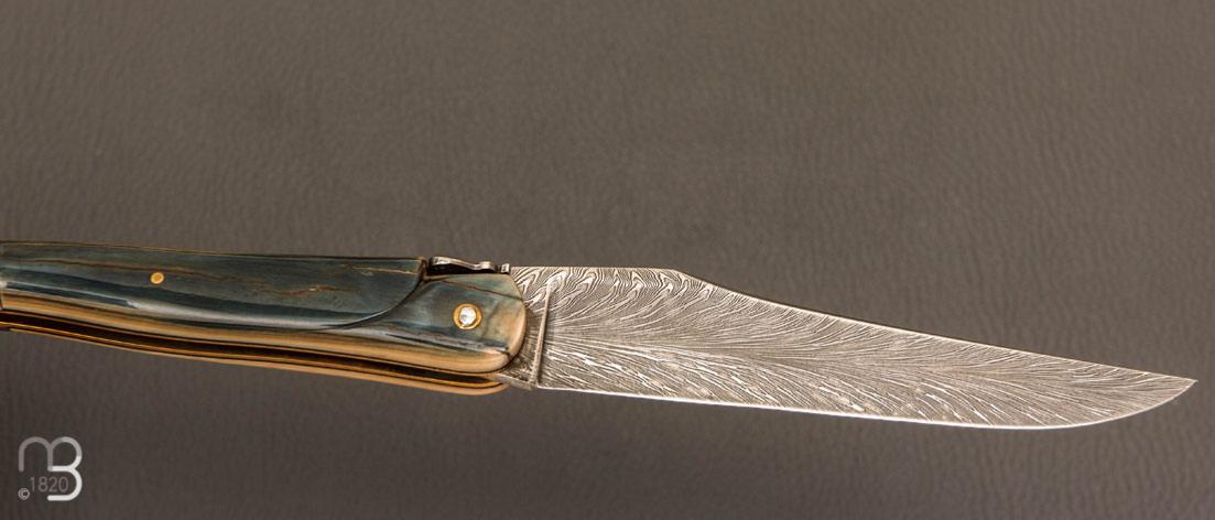 Un couteau Laguiole "Queue de Scorpion" de collection avec un manche en croûte de mammouth et une superbe lame en damas plume.