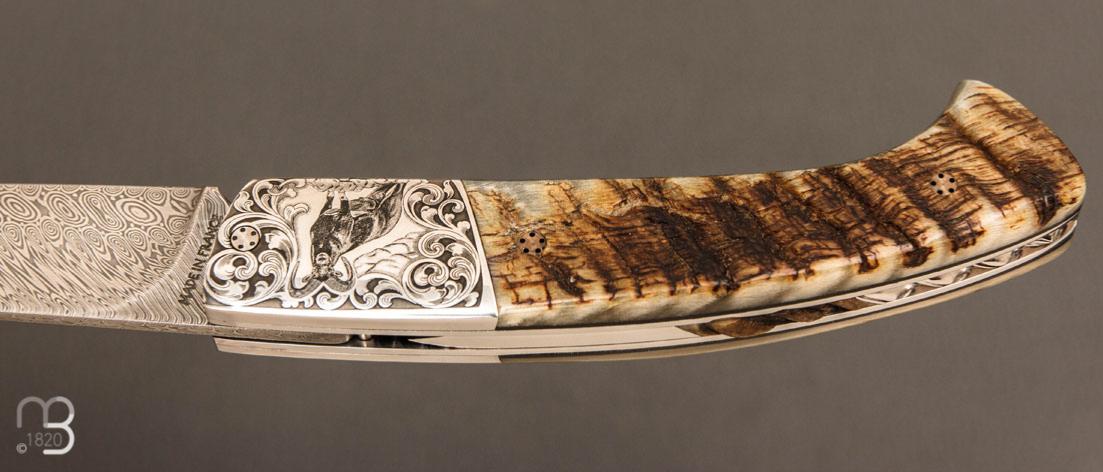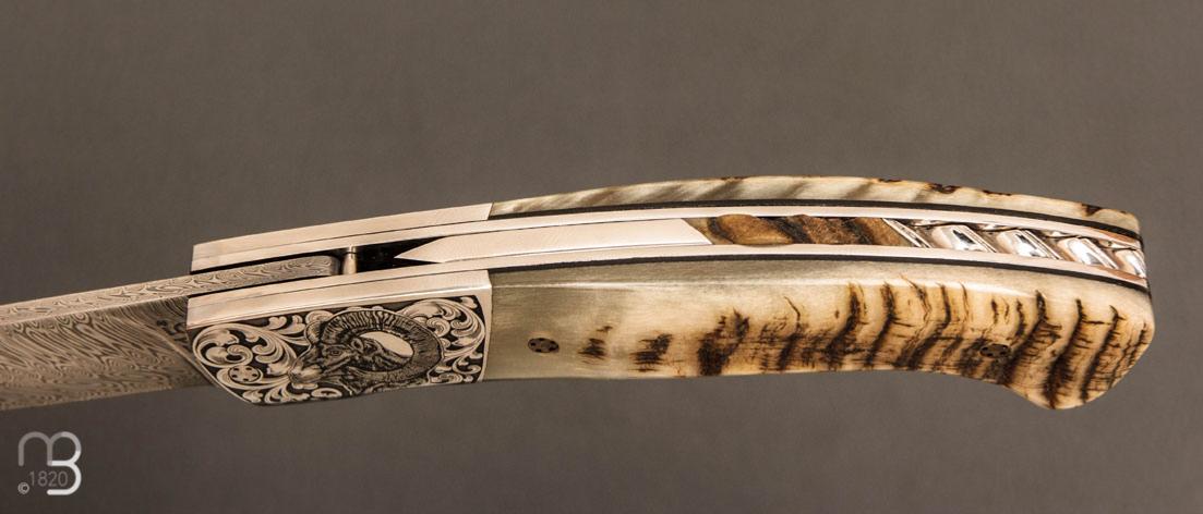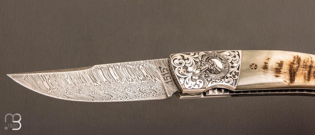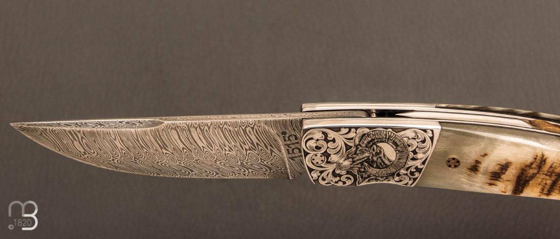 Couteau de poche 1515 corne de mouflon et damas par Manu Laplace, modèle ''L'Approche au Mouflon'', réalisé en série limitée, avec une superbe lame damas et des mitres gravées en partenariat avec Jérémy Dewit.