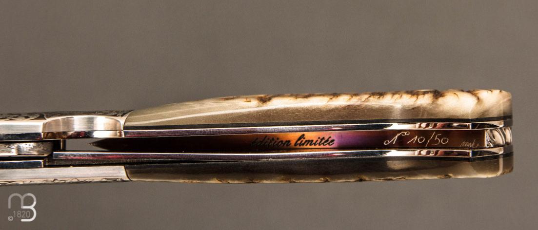 Tous les deux amoureux du travail bien fait, ce couteau en édition limitée a été réalisée en partenariat avec Jérémy Dewit. Après avoir gravé l'original, Manu Laplace a mis au point un process de micro gravure (1 micron cube), afin de reproduire l'oeuvre du graveur.