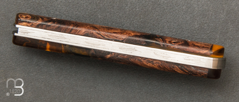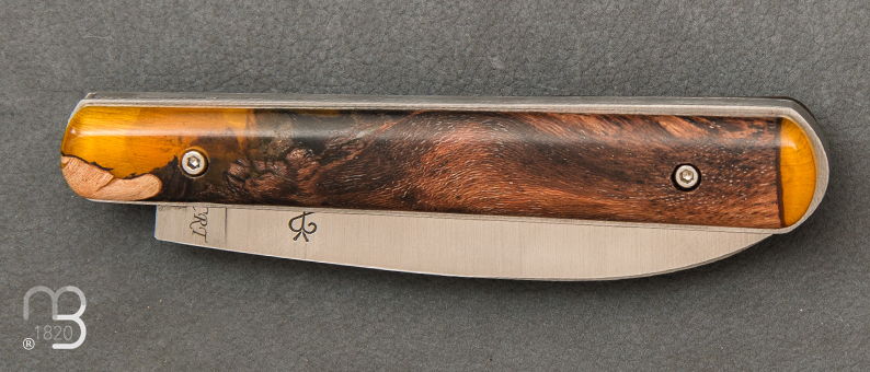 Comment ne pas succomber en voyant ce manche en cèpe de vigne stabilisé, évoquant les belles robes dorées de nos merveilleux Condrieu?