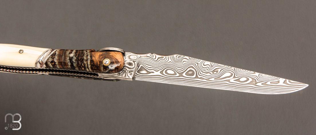 Couteau " Laguiole Bacchus " de poche par Philippe Voissière - Phacochère/Molaire de mammouth et lame en Damasteel