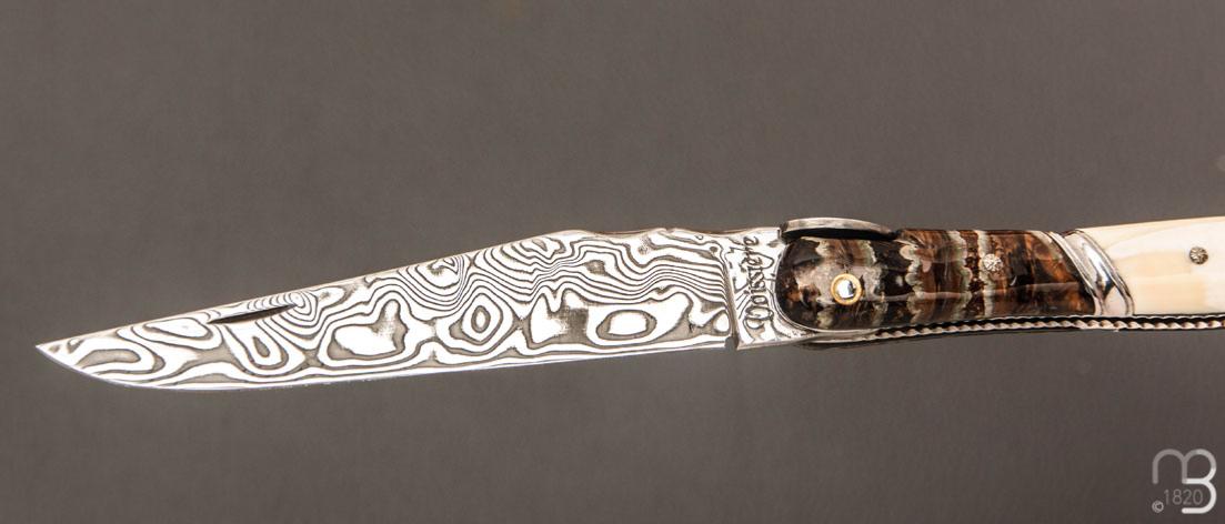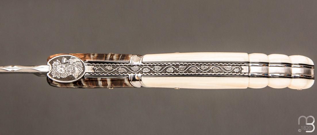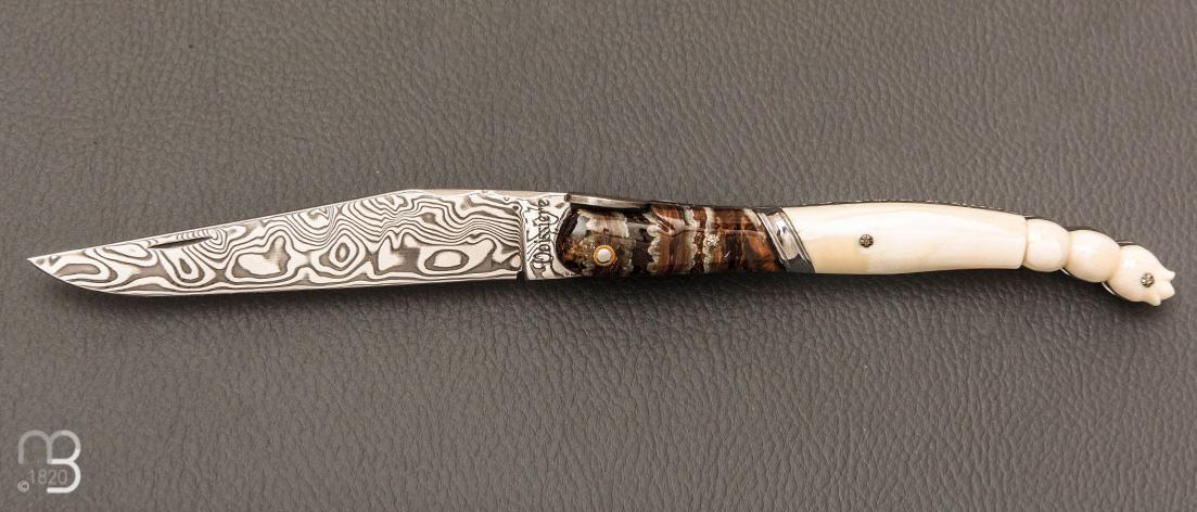 •    Couteau " Laguiole Bacchus " de poche par Philippe Voissière - Phacochère/Molaire de mammouth et lame en Damasteel