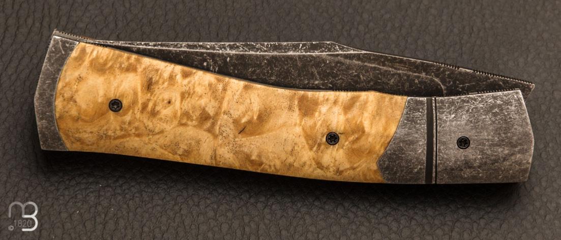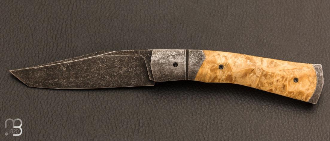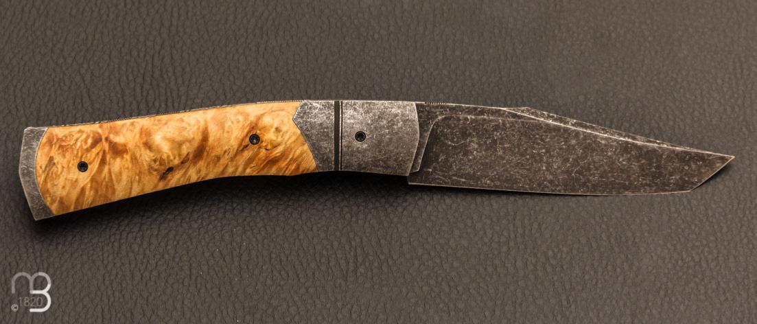 Couteau de poche "Oiseleur" plaquettes loupe de bouleau stabilisée, fait main par Cyril Kalisz.