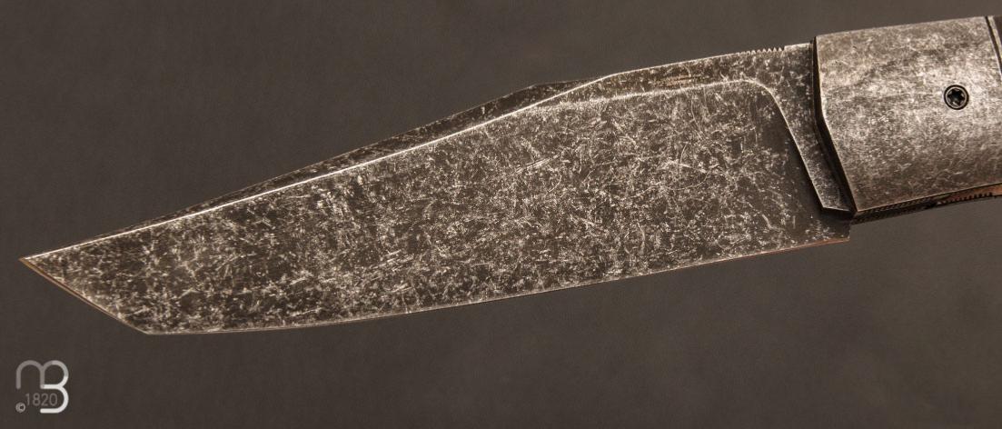 Mitres en acier inoxydable 14c28n trempées finition stonewashed. Lame forme tanto en acier SHV Sprayform de Achim Wirtz, finition stonewashed