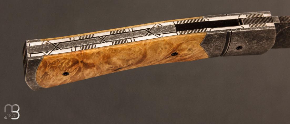 Manche en loupe de bouleau stabilisée et platines en titane grade 5 finement guillochées.