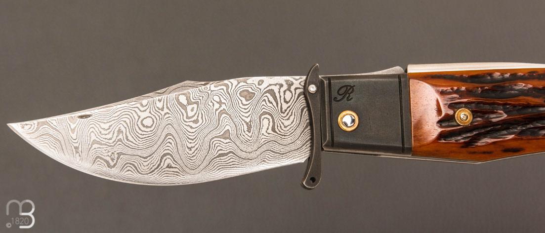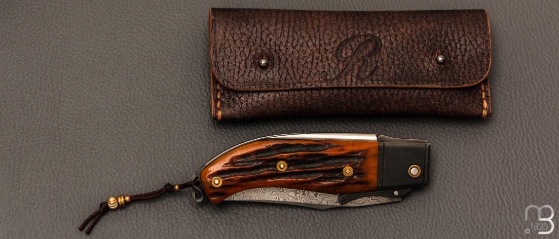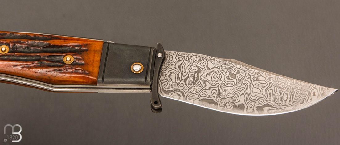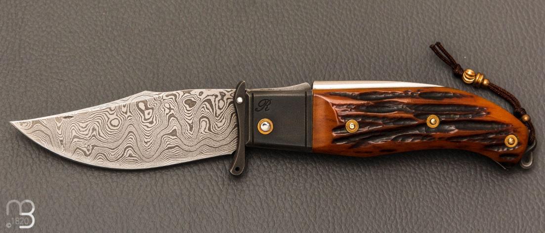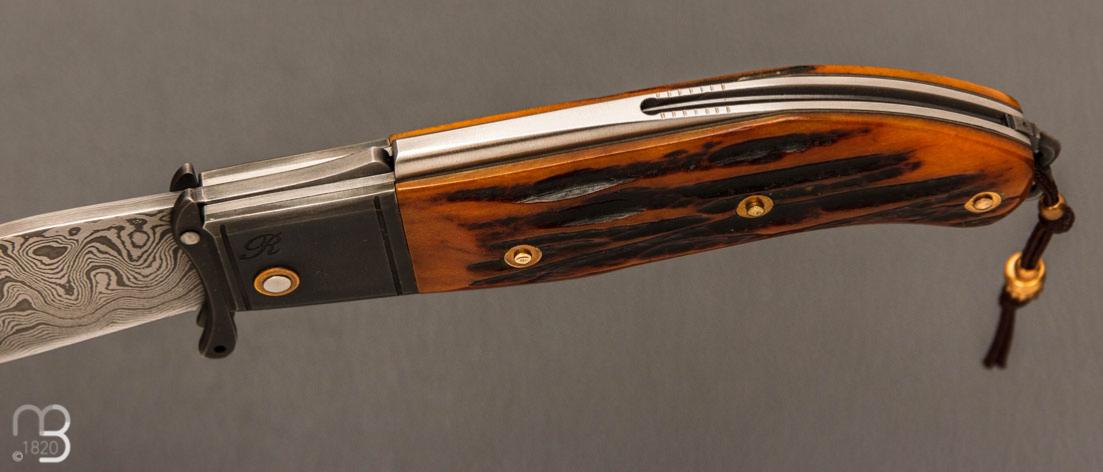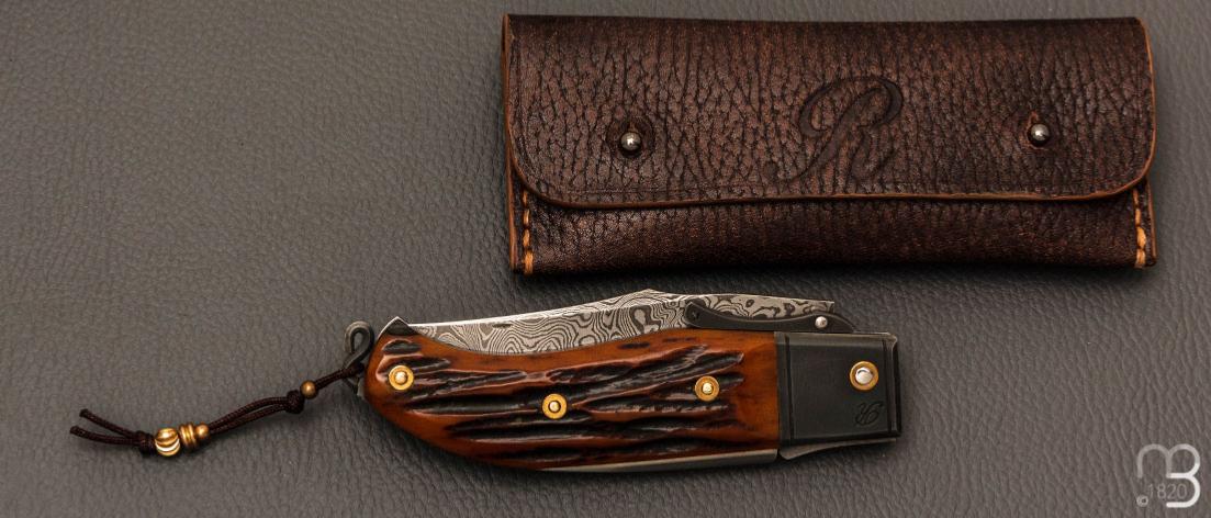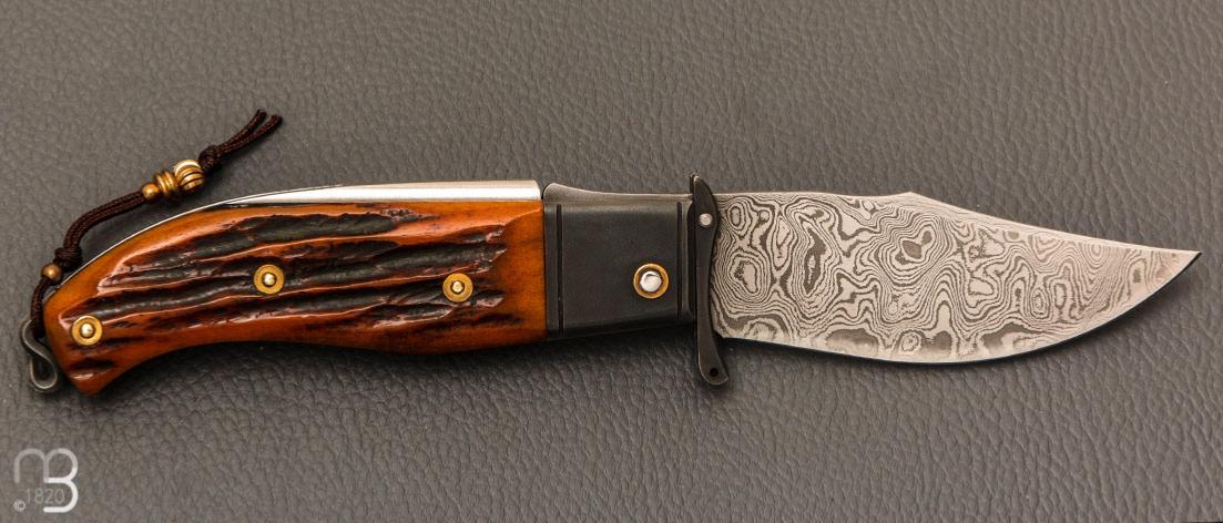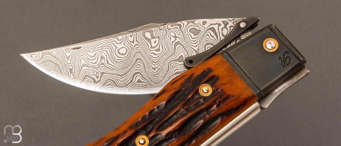 Couteau " Truand garde mobile " par Tony Ruot - Os cerfé et lame en damas feuilleté