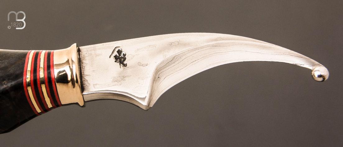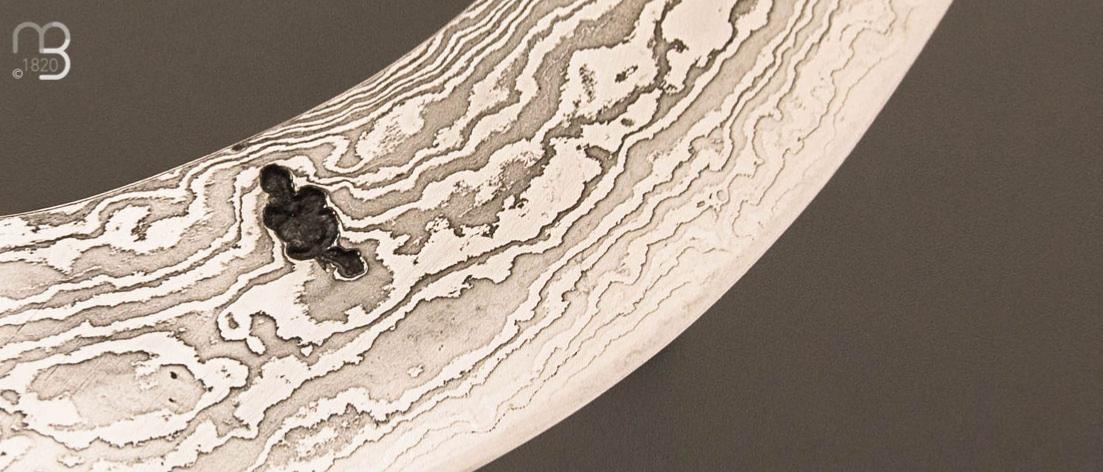 - Un "Ulu" avec manche en loupe de frêne et lame en damas également, (Le "Ulu" est un outil spécialement conçu pour dépouiller, enlever la peau)