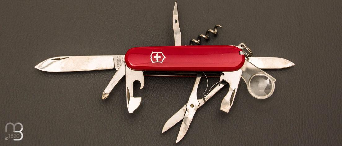 Couteaux Victorinox Explorer. Longueur manche : 91 mm. Disponible en deux couleurs : rouge ou noir. Grande lame avec onglet/ petite lame / tire-bouchons / ouvre-boîtes avec petit tournevis (aussi pour vis cruciformes) / décapsuleur avec tournevis-dénudeur de fil électrique / poinçon alésoir / pincettes / cure-dents / ciseaux / crochet à usages multiples / tournevis Phillips / loupe / anneau.